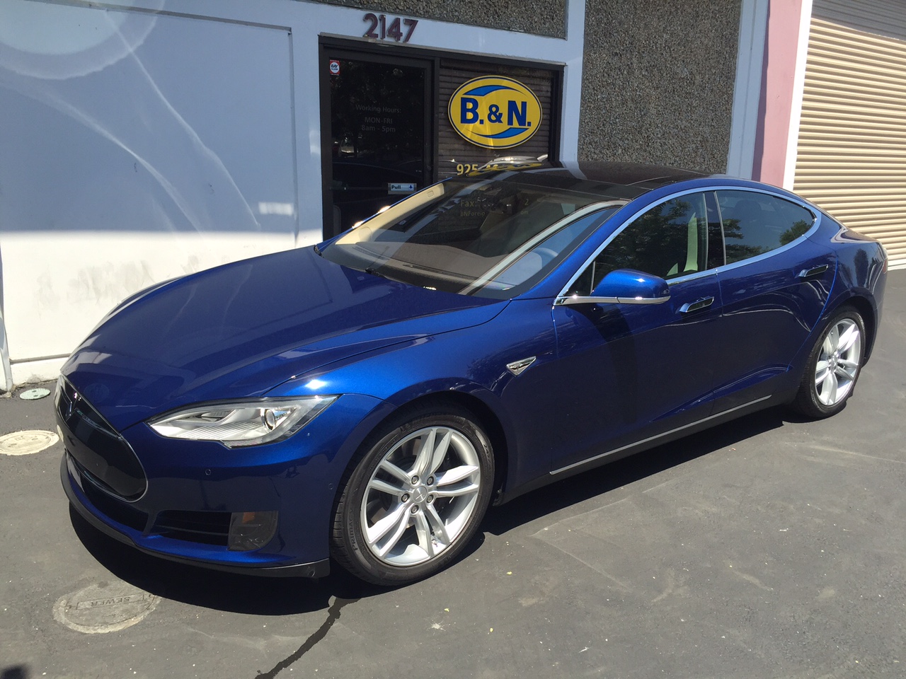 Before I put 8,000 or more highway miles on this car, I need to be sure the Tesla’s paint is protected from rock chips and other hazards of the road. For this reason I used the Teslamotorsclub.com forums to find an installer of Xpel film with a great track record for their work. Thus, last week I dropped my car off in Walnut Creek, CA, so that Joe Torbati and his crew at OCDetailing could install Xpel and then coat the whole car with Opticoat Pro. I couldn’t be happier with the work! Here’s a photo: