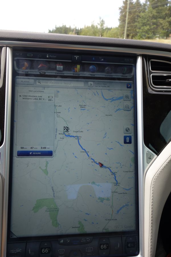 The Tesla navigation page indicated I would arrive in Williams Lake with 22% of charge remaining. If driving slightly over the speed limit, I find these estimates are usually accurate within about 3% once the Tesla digests my driving style.