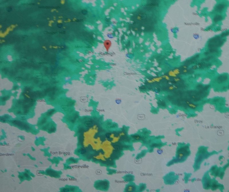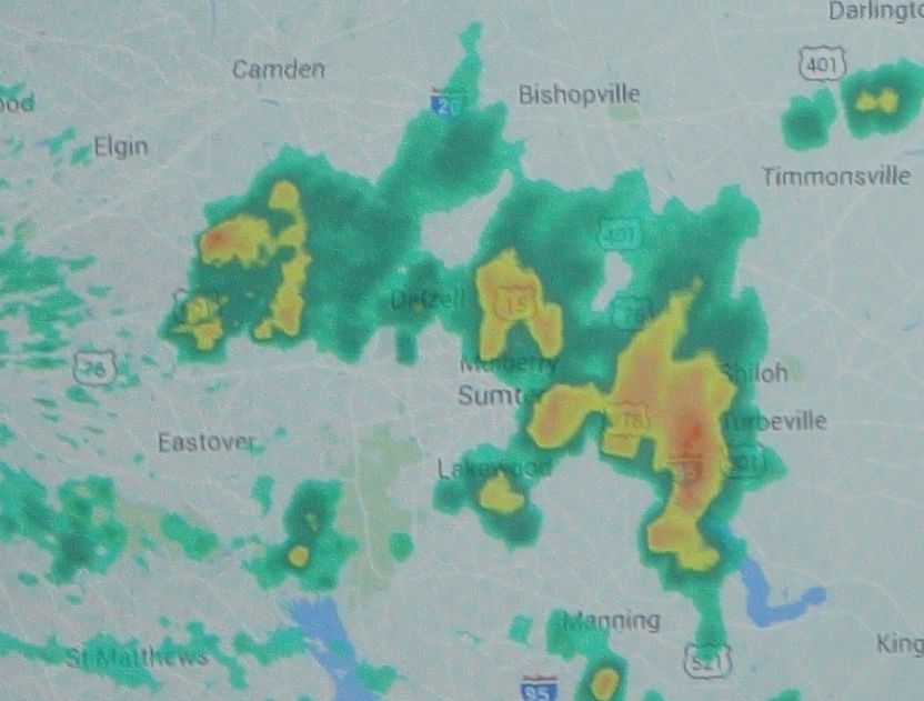 Later, in South Carolina, I encountered a nastier thunderstorm on my internet radar site. This one had transitions from no precipitation to heavy precipitation in a very short distance, which meant this was a mean wooly-bugger that could contain hail and all sorts of undesirable trappings. Another problem of wandering into a thunderstorm while on a freeway is that there’s no quick way to turn around and dash for cover. You’re moving with the traffic and only an off-ramp can help.