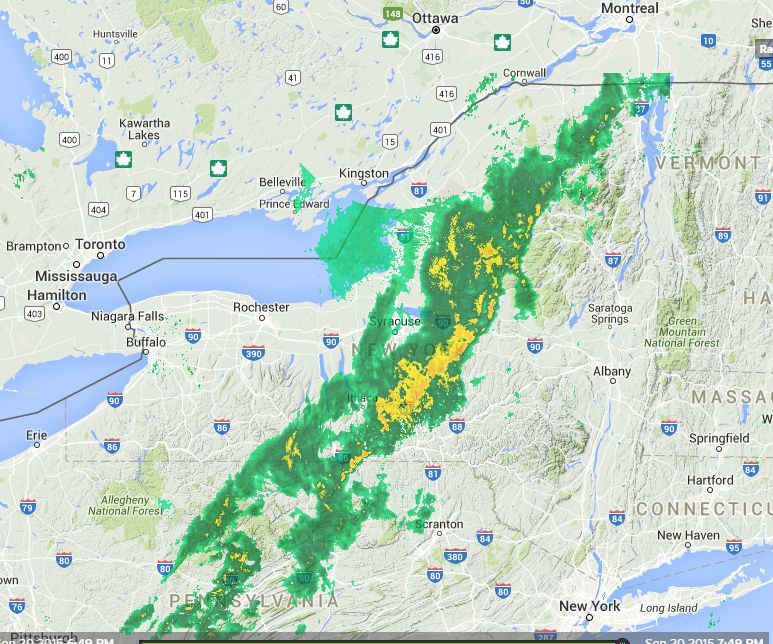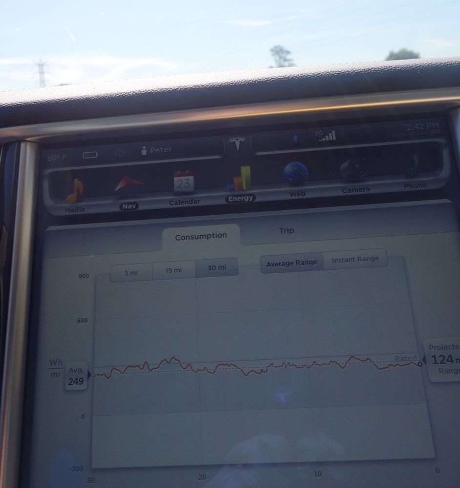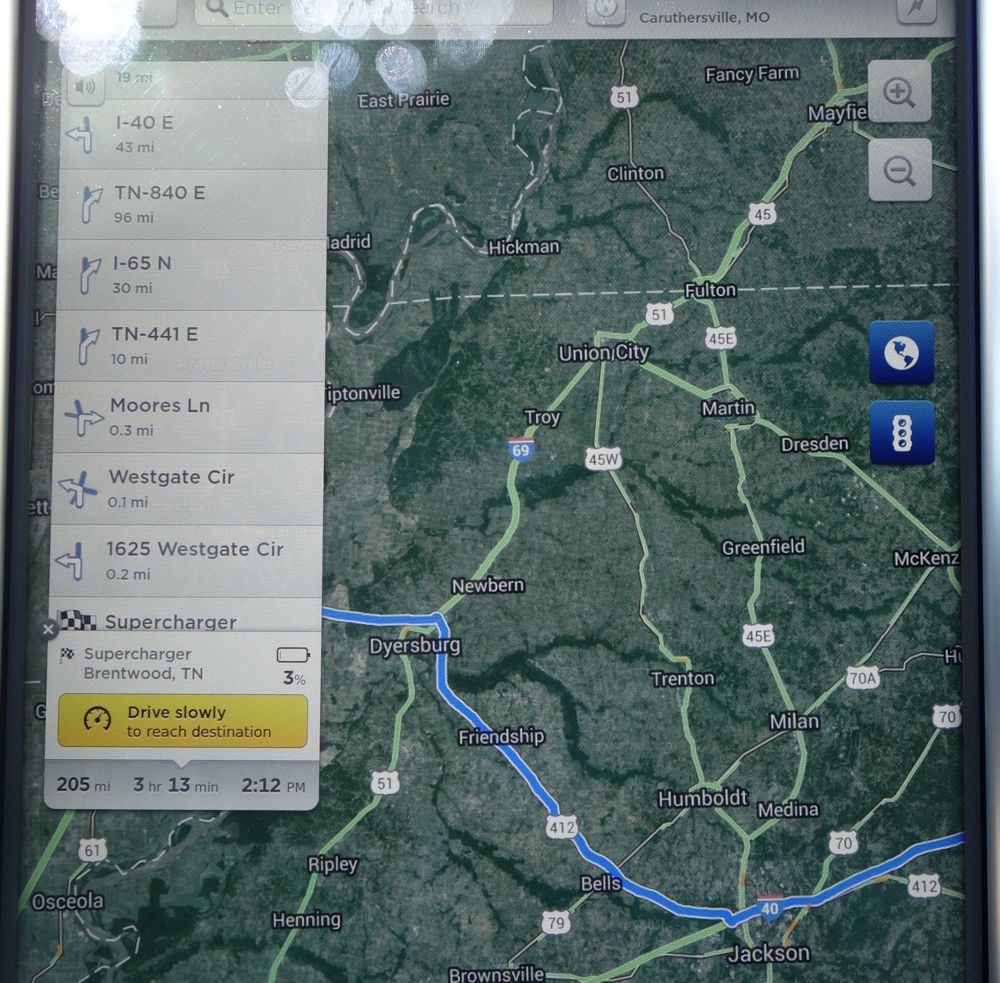 To catch a good view of the boundaries and movement of thunderstorms, I use internet weather from http://www.wunderground.com or http://www.intellicast.com . You can too. Weather radar picks up the reflection from raindrops. Light precipitation is shown on a radar image as green, with moderate showing as yellow and heavy as either red or some other color determined by the weather site. I avoid thunderstorms for two main reasons: hail and the effects of heavy rain and wind on traffic. A Tesla’s aluminum skin is vulnerable to the effects of large hailstones, and any car is vulnerable to the combination of poor visibility, slick roads, and crazy or poor drivers barreling along in close proximity with other vehicles. Just as in an airplane, the best course of action is to avoid a thunderstorm, and radar images pulled up on your 17″ screen can allow you to do just this.