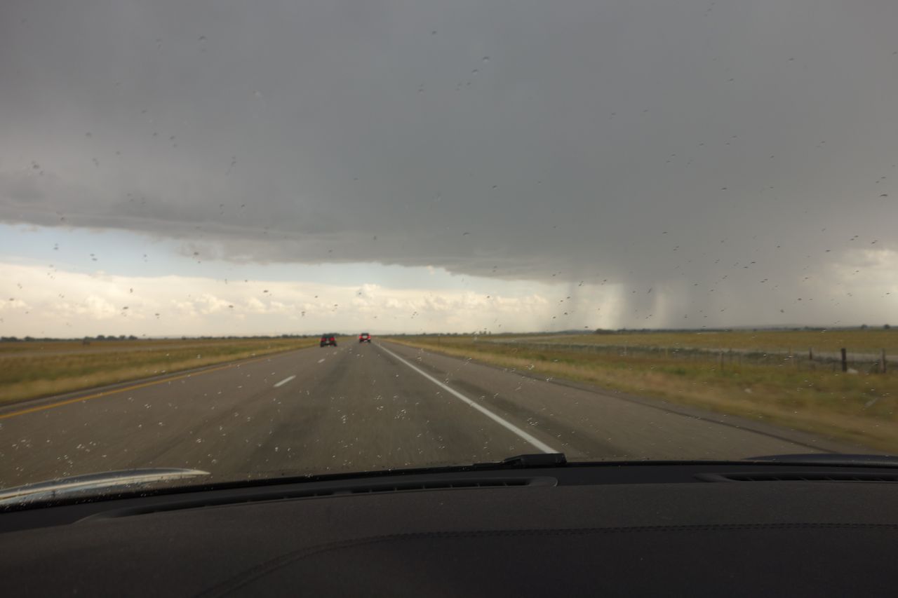 The yellow precipitation area in the bottom center of the image struck me as an area that likely didn’t pose a hail threat (transitions from light to heavier precipitation was fairly gradual, and precipitation for the most part wasn’t much worse than moderate. I chose to drive through it and although there was no hail, the driving was most unpleasant. This was about my limit of what I will knowingly venture into.