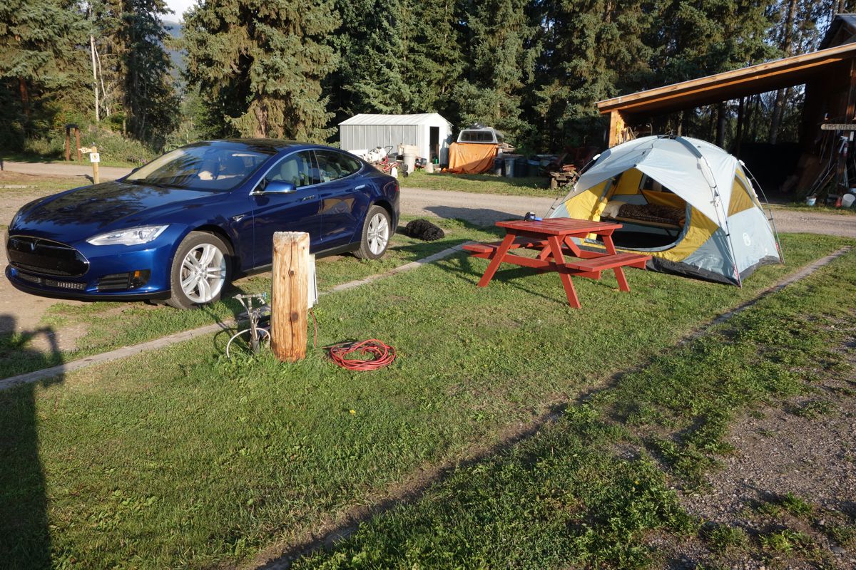 As I neared Smithers and the traffic picked up, I had the confidence to increase my speed. At destination the Tesla still showed more than 50 miles range remaining. I could have overnighted at Smithers, but such a move would mean a long recharge the next day at Houston. Instead, I did about a 6 hour recharge with the 110 volt, 12 amp charge at Smithers as I rested. Then, as the evening light offered just enough illumination for a comfortable 40 mile drive uphill to Houston, I set off.